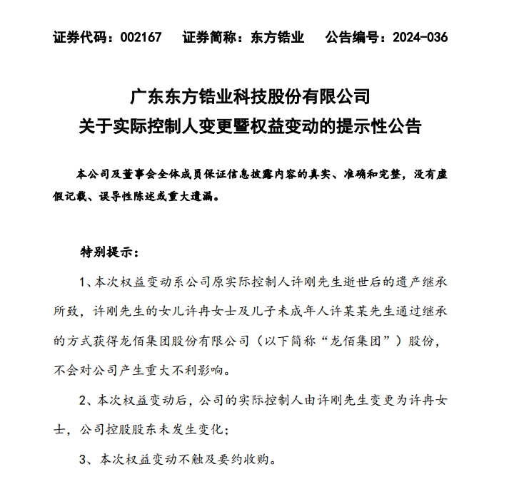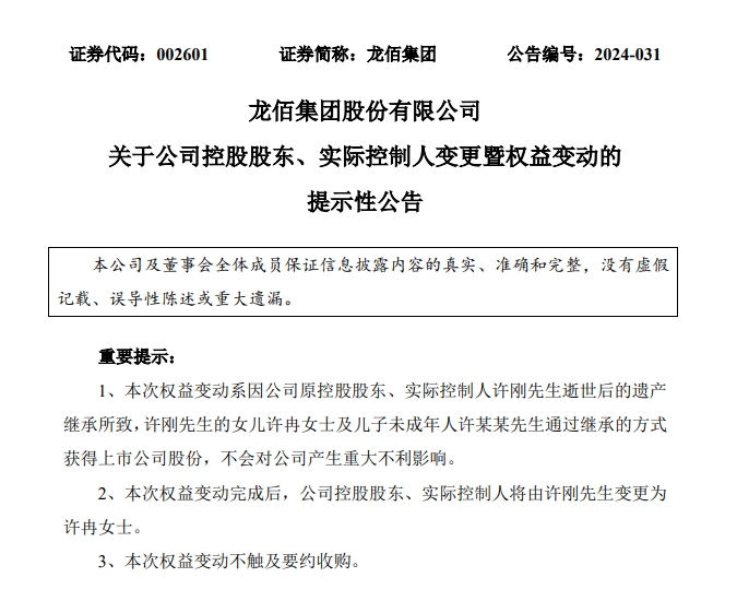 龙佰集团原控股股东、实际控制人、名誉董事长许刚于2024年5月20日因病医治无效离世,享年61岁。据了解,许刚生前未订立遗嘱,也未与他人签订《遗赠扶养协议》。